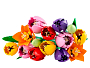 • Букет из 5 тюльпанов LEGO®: включает 5 сортов тюльпанов разных цветов и стадий цветения: зеленые бутоны, фиолетовые закрытые тюльпаны, а также красные, желтые и розовые распустившиеся тюльпаны.