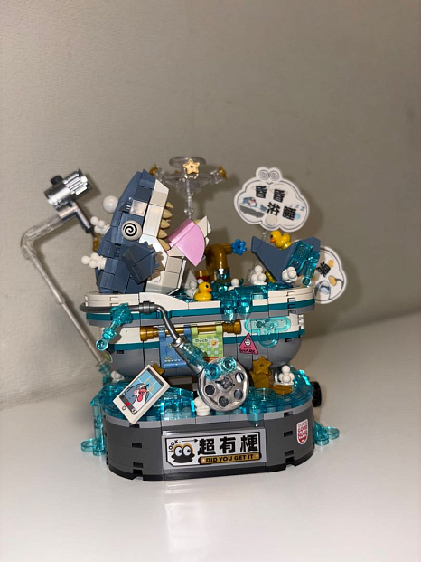 Набор выпрашивал ребенок. Увидел его на полках в магазине и очень приглянулся. В наборе достаточное количество деталей. А сама задумка очень забавная. Акула которая купается, отдыхает в ванне вместе с «резиновыми» уточками и пеной для ванной. Этот Конструктор с продуманной детализацией, сборка была в радость моему ребенку. Также стоит отметить и то, что инструкция была продуманной. Размер конструктора небольшой получился, в высоту чуть меньше десяти сантиметров.