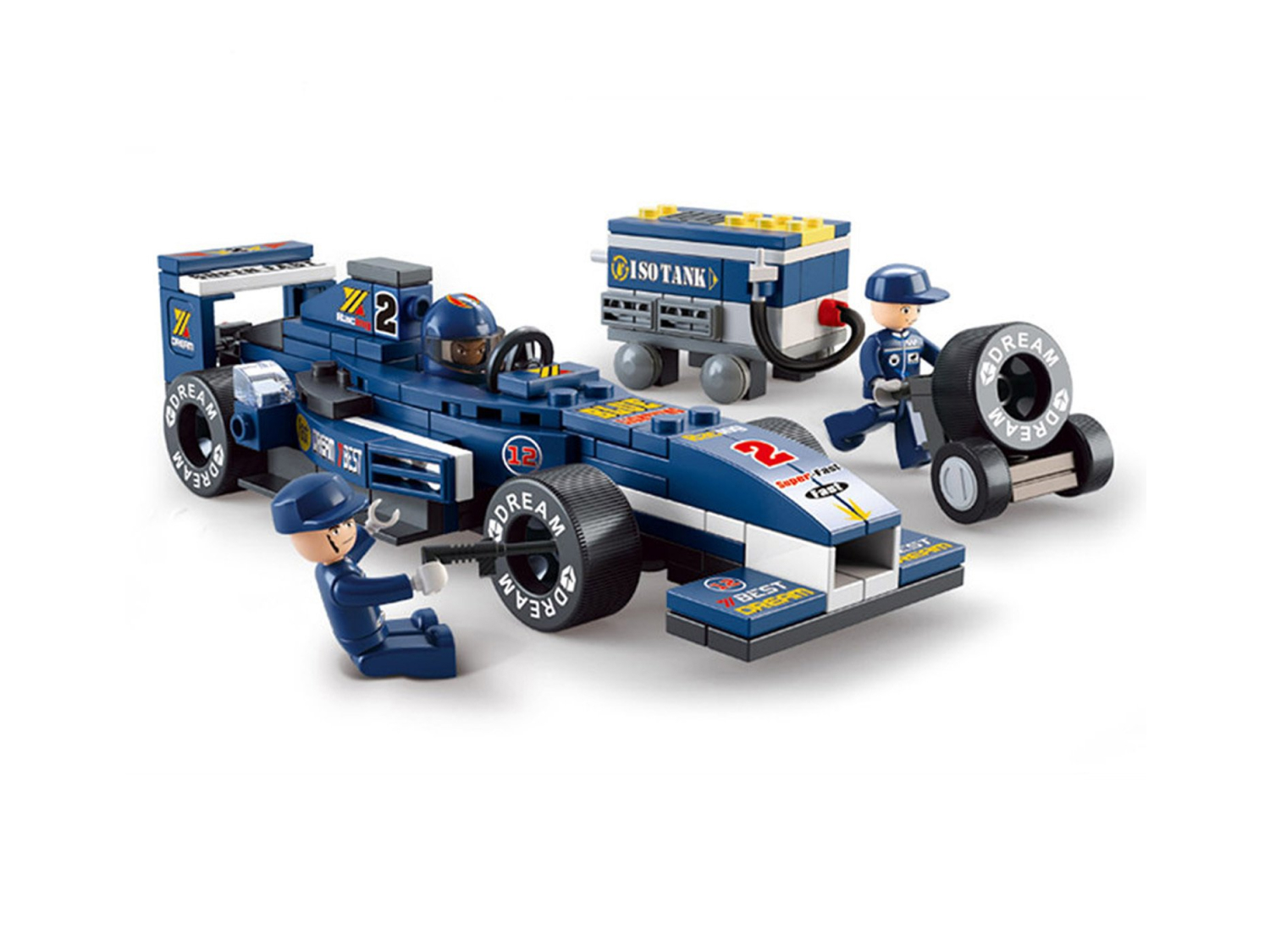 Соберите великолепный синий болилд с помощью конструктора Sluban Автогонки «Синий гоночный автомобиль F1» и оправляйтесь на трассу. Пилот уже занял место в кабине, а два механика ждут его на станции